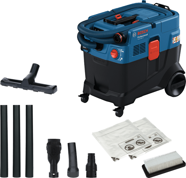 - The Bosch GAS 400 A Professional is a versatile wet/dry dust extractor designed for job-site use. Its powerful 1,200 W motor delivers high suction performance, while the 28 L net container and 20 L water capacity mean you can handle both heavy dust loads and wet applications. With Bosch’s AFC technology, filter clogging is minimized, ensuring consistent airflow. The design emphasises practicality: a hose-less container for easier emptying, anti-tipping motor head for better stability, and built-in hose storage for compact transport and job-site maneuvering. Whether cutting concrete, grinding, or sanding, this extractor is built to maintain high productivity and cleaner work environments.