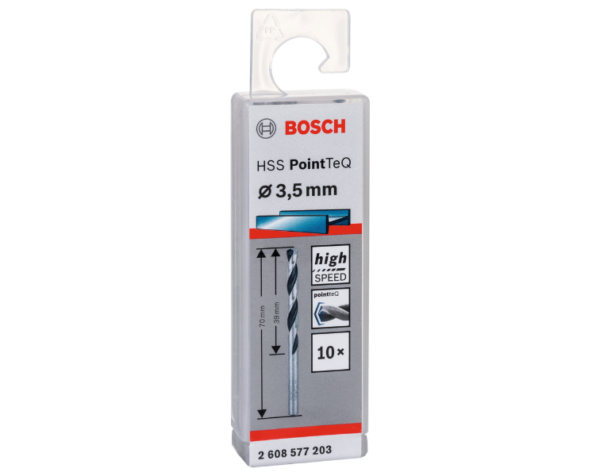 - This Bosch HSS PointTeQ 3.5 mm drill bit is designed for high‑precision drilling in metal and multi‑materials. With its compact diameter, the self‑centring 135° tip delivers accurate drilling starts, while the HSS build ensures durability and consistent performance. Its compatibility with various materials makes it ideal for workshop and professional tasks where small, precise holes are required.