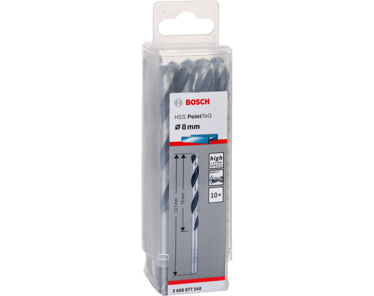 - The Bosch HSS PointTeQ 8 mm drill bit delivers fast, accurate drilling in metals and plastics. Its self-centring tip prevents tip drift, while the HSS construction and black-oxide finish ensure long life and efficient chip removal, making it ideal for workshop and professional use.